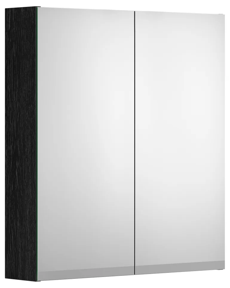 Musta peilikaappi kahdella kaksipuolisella peiliovella Gustavsbergiltä, 60 cm. Alareunat on huurrettu, jotta peiliin ei jää rasvatahroja.