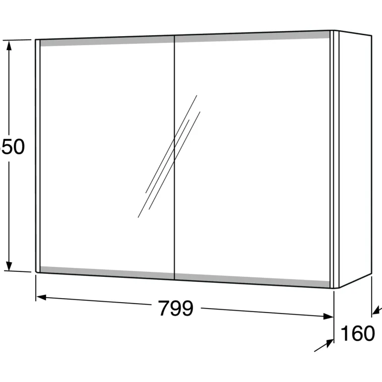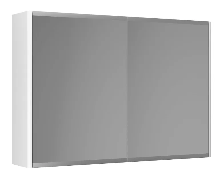 Peilikaappi, jonka leveys on 80 cm ja jossa on 2 irrotettavaa lasihyllyä. Kaksipuoliset peiliovet, joissa on huurretty alareuna himmentämässä rasvajälkiä.