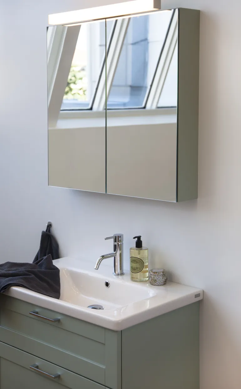 Ajattomasti muotoiltu peilivalaisin, valkoiseksi maalattua alumiinia (RAL 9016) huurretulla kuvulla. Antaa tasaisen valokuvion. Erittäin hyvä värintoisto, RA>90 IP44-luokitus ja täyttää pienten kylpyhuoneiden vaatimukset julkisissa ja yksityisissä tiloissa. Voidaan asentaa seinää vasten ja kylpyhuoneen kaapin päälle mukana tulevalla kiinnikkeellä, mukana myös koroke johtojen pinta-asennusta varten. Vaihehimmennettävä liitäntälaite integroitu valaisimeen suoraa 230V kytkentää varten. Kaksoisläpiviennit, joista toinen keskitetty, sekä pikaliitin ketjutusta varten.