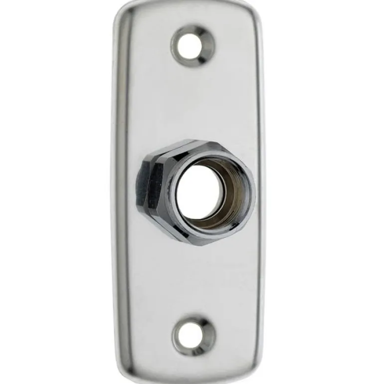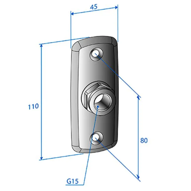 Ruostumattomasta teräksestä valmistettu peitelaippa, 1-reikäinen, kiillotettu pinta ja sisäinen G15-kierre. 15×2,5 PEX-putkelle. Levyn mitat ovat 110 x 45 mm ja ruuvinreikien etäisyys on 80 mm. Sisältää kytkentäsarjan.