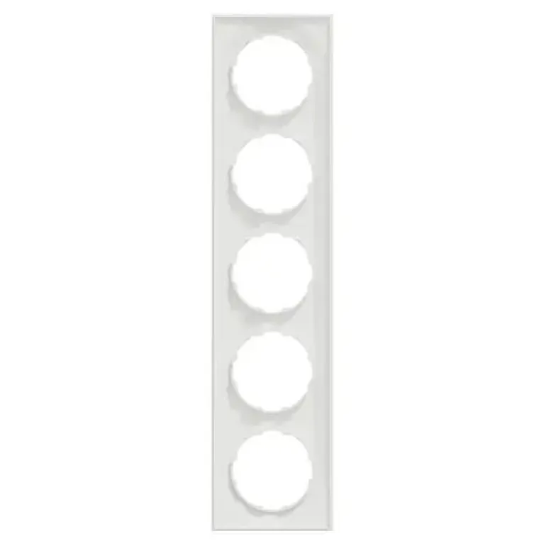 ELKO One 5-kehys, jonka mitat ovat (L) 87 mm x (K) 371 mm x (S) 10,5 mm. Se on valmistettu kierrätetystä polykarbonaatista (PC). Tuotteen väri on kirkkaan valkoinen (RAL 9003) ja se on mattapintainen. Se saavuttaa IP21-suojaustason.