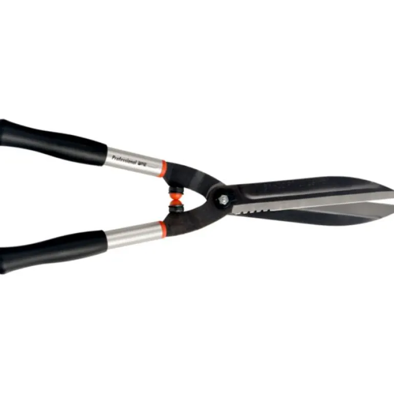 Pensassakset ammattikäyttäjälle, kulutusta kestävät alumiiniset varret. Läpikarkaistujen terien ansiosta leikkuri sopii paksuja oksia sisältävien pensasaitojen leikkaamiseen. Terien pituus on 25 cm ja saksien kokonaispituus 57 cm.
