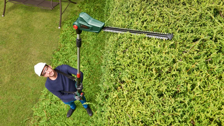 Ergonominen muotoilu mahdollistaa korkeiden pensasaitojen helpon trimmauksen.