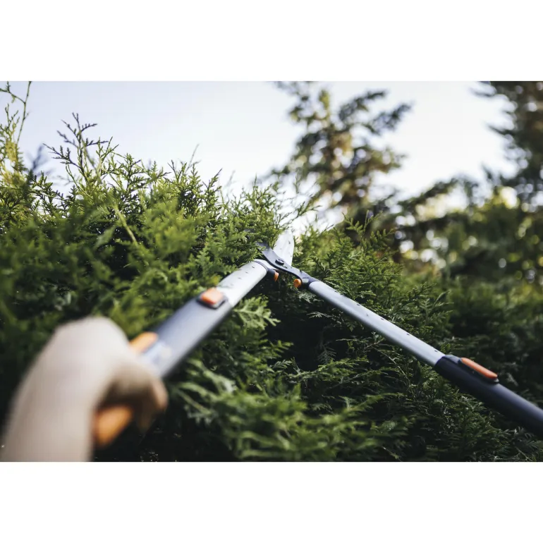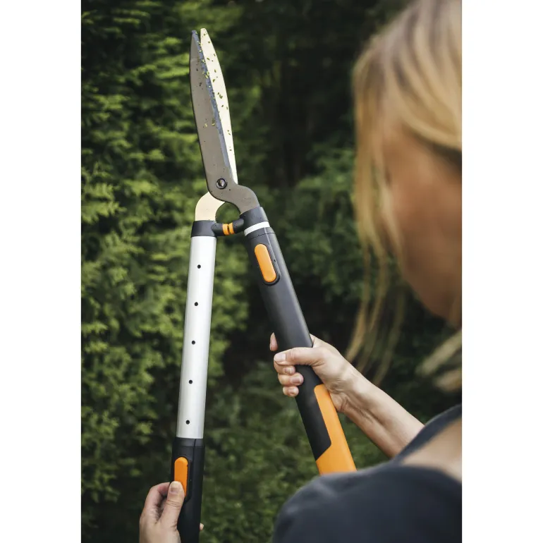 Fiskars SmartFit -pensasleikkureissa on terävä ja kiinteä terä karkaistua hiiliterästä ja kitkaton pinnoite yläterällä. Kahvojen oransseilla painikkeilla hallittavat teleskooppitoiminnot antavat hieman ylimääräistä ulottuvuutta, kun leikkaat suurempia tai korkeampia pensasaitoja.