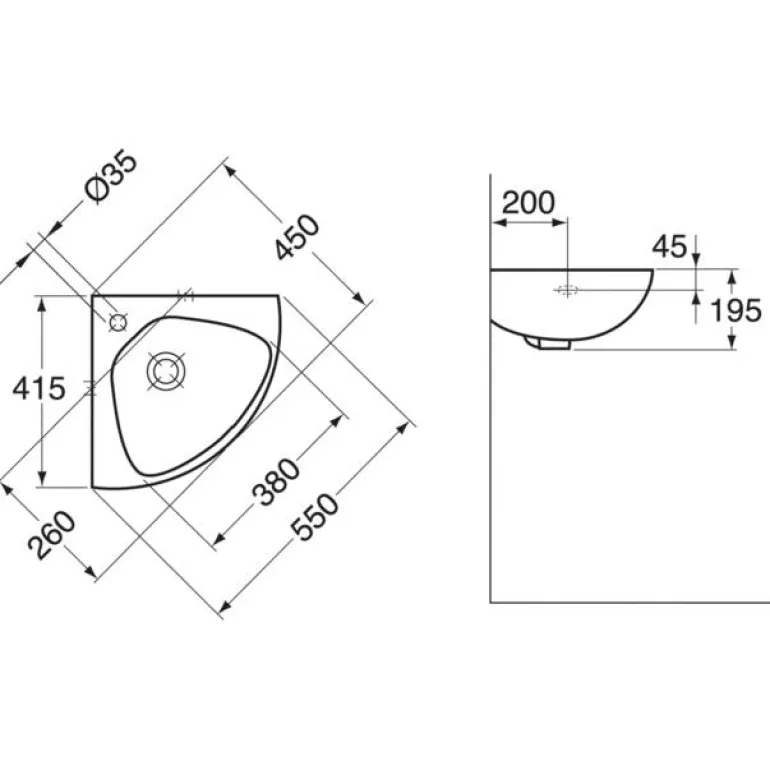 Seinään asennettava pesuallas kiinnitettäväksi pulteilla kulmaan. Pieni malli, joka sopii ahtaisiin tiloihin. Sisäleveys enimmillään 380 mm ja sisäsyvyys 260 mm.