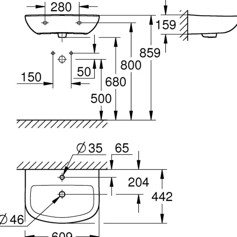 GROHE Bau Ceramic on seinään kiinnitettävä pesuallas, jonka koko on 609 x 492 mm. Pesualtaassa on yksi reikä ja ylivuotoaukko, ja se on valmistettu posliinista.