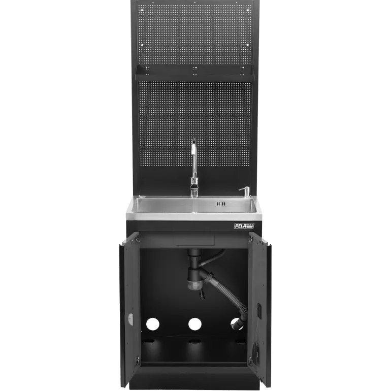 PELA 546476 on ruostumattomasta teräksestä valmistettu pesuallas, jossa pohjakaappi ja hylly ripustettuna työkalutauluun/levyyn. Sopii yhteen PELA 2.0 546213 työpistekalusteen kanssa (harmaa/musta, tuotenro 546213). Pesuallas on varustettu hanalla, koripohjaventtiilillä, tulpalla ja saippua-annostelijalla. Valmisteltu vesiliitäntää varten. Lähin värikoodi punaiselle RAL 7016.
