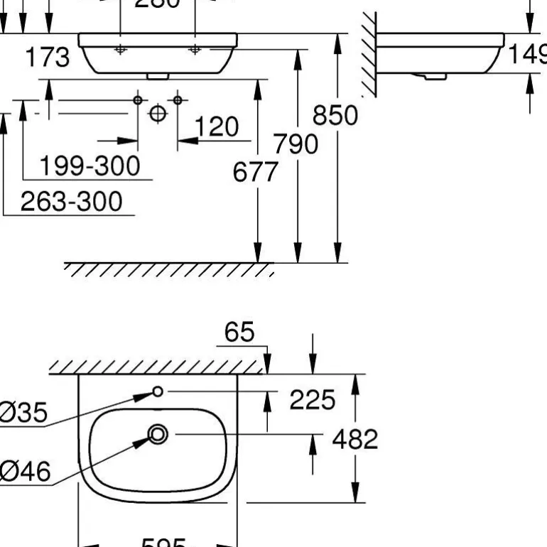 GROHE Euro Ceramic on seinään kiinnitettävä pesuallas, jonka koko on 600 x 480 mm. Pesualtaassa on reikä ja ylivuotoaukko, ja se on valmistettu posliinista.