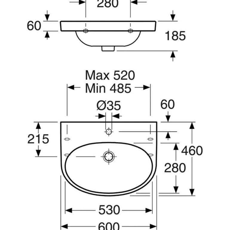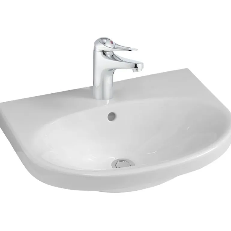 Pultti- tai kannakekiinnitykseen seinää vasten. Pesuallas on valmistettu hygieenisestä, kestävästä ja sintratusta saniteettiposliinista. Sen soikea muoto tarjoaa paljon laskutilaa. Sekoittimessa on kylmäkäynnistystoiminto, se sulkeutuu pehmeästi keraamisella sululla ja siinä on sisäänrakennettu, helposti säädettävä virtauksen rajoitin ja lämpötilan rajoitin. Pesualtaan leveys on 600 mm ja syvyys 460 mm.
