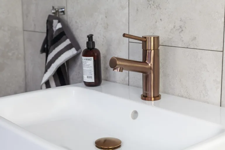 Tyylikäs pesuallashana, harjattu roseekulta. Sopii luontevasti kaiken tyyppisiin kylpyhuoneisiin. GDV-hyväksytty juomavedelle. 35 mm:n keraaminen säätöosa.