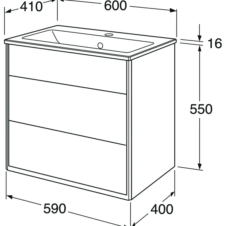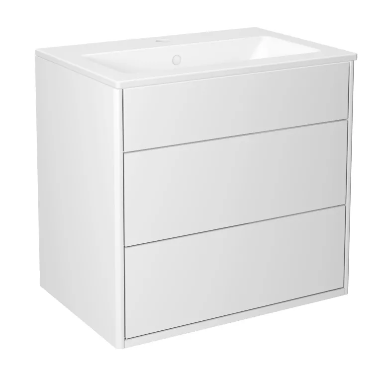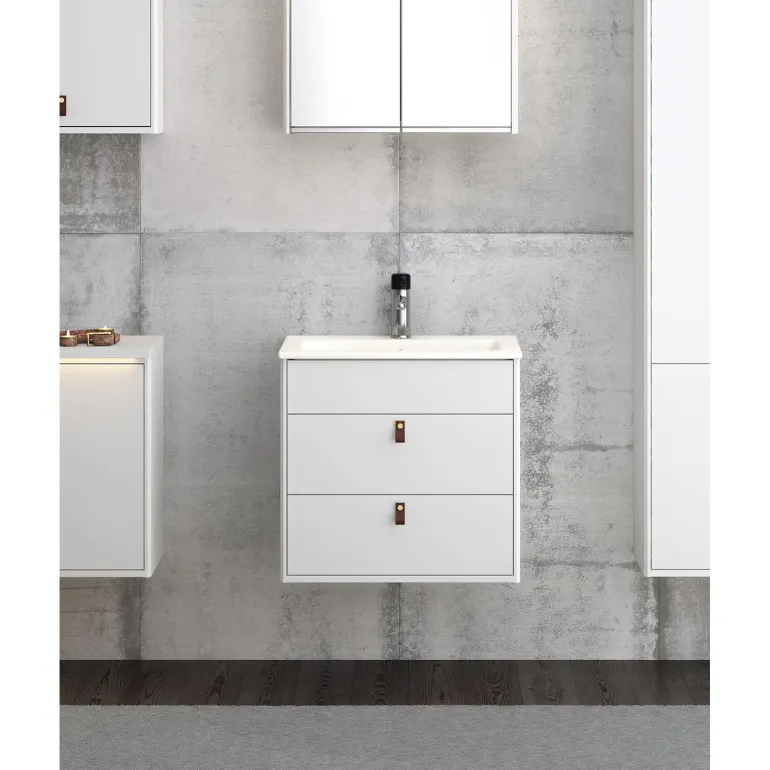 60 cm:n valkoinen alalaatikosto, jossa on posliininen pesuallas. Varustettu 2 pehmeästi sulkeutuvalla laatikolla, joissa on täysi ulosveto sekä 1 piilolokero laatikoiden yläpuolella. Piilolokero tarjoaa ylimääräisen laskutilan avattuna.