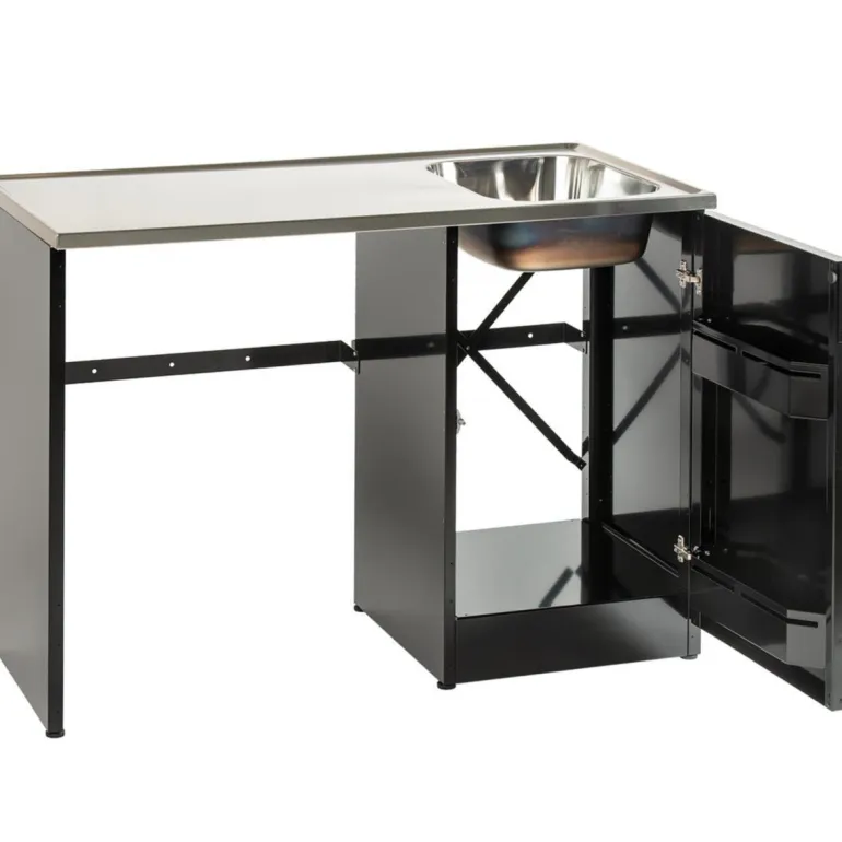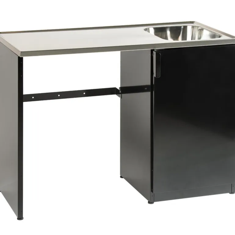 Nimo TB 1200 HT on pesupöytä/allaskaappi, jonka runko ja sen osat pinnoitettua terästä. Mallissa on reilunkokoinen pesupöytä ruostumatonta terästä ja tila pyykinpesukoneelle.