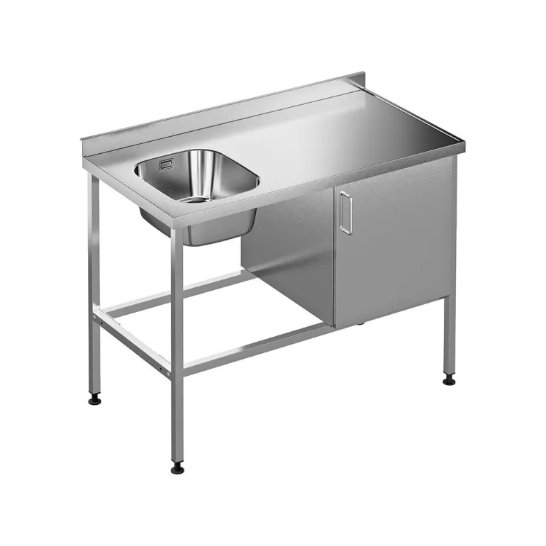 Pesupöytä jalustalla (hygieninen malli), jossa työtaso 1,25 mm hiotusta ruostumattomasta teräksestä. Mukana vesilukko ja koripohjaventtiili, pesuallas Iris 3440 (sijoitettu vasemmalle). Malli on valmiiksi koottu, kaappi 600 mm oikealla. Voidaan täydentää hyllyllä/ritilähyllyllä (irrotettava). Etu- ja sivureunat mallia 3. Takareunan korkeus 60 mm, etureuna 40 mm. Jalustan/jalkojen mitat 30×30 mm (neliöputkea), säädettävillä muovijaloilla.