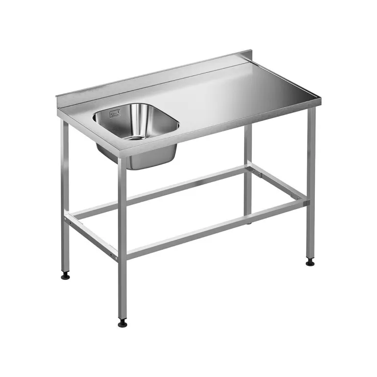 Pesupöytä jalustalla (hygieninen malli), jossa työtaso 1,25 mm hiotusta ruostumattomasta teräksestä. Mukana vesilukko ja koripohjaventtiili, pesuallas Iris 3440 (sijoitettu vasemmalle). Voidaan täydentää hyllyllä/ritilähyllyllä (irrotettava). Etu- ja sivureunat mallia 3. Takareunan korkeus 60 mm, etureuna 40 mm. Jalustan/jalkojen mitat 30×30 mm (neliöputkea), säädettävillä muovijaloilla.