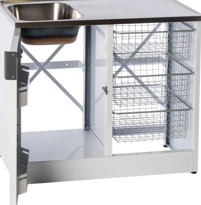 Nimo TB 1000 HT on valkoinen pesupöytä, jonka runko ja sen osat pinnoitettua terästä. Puoliavoin malli, jossa on yksi ovi, kolme tilavaa verkkokoria, tila pesuaineille, kaksinkertaiset säilytyslokerot ovessa (jossa hidastin, piilosaranat ja lapsilukko) sekä täysin integroitu alusta.