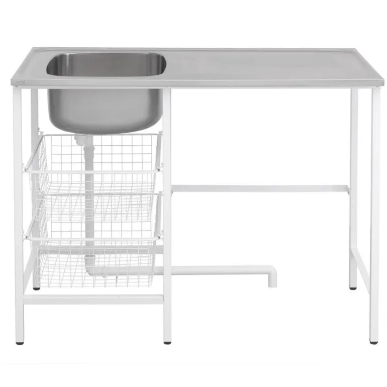Pesupöytä jaloilla, jossa paikka pesukoneelle. Taso on kuviovalssattua ruostumatonta terästä, ja pesupöytä on käännettävissä. Toimitetaan kokoamattomana pakkauksessa, tuote on helppo kuljettaa ja koota.