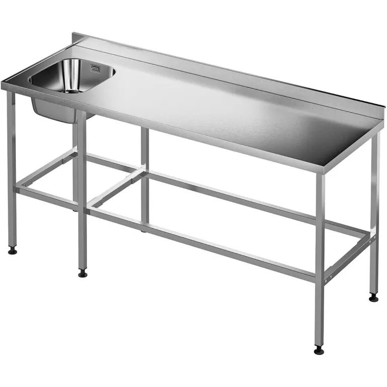 Pesupöytä jalustalla (hygieninen malli), jossa työtaso 1,25 mm hiotusta ruostumattomasta teräksestä. Mukana vesilukko ja koripohjaventtiili, pesuallas Iris 3440 (sijoitettu vasemmalle). Valmisteltu pesukoneelle ja kuivausrummulle oikealla. Voidaan täydentää hyllyllä/ritilähyllyllä (irrotettava). Etu- ja sivureunat mallia 3. Takareunan korkeus 60 mm, etureuna 40 mm. Jalustan/jalkojen mitat 30×30 mm (neliöputkea), säädettävillä muovijaloilla.