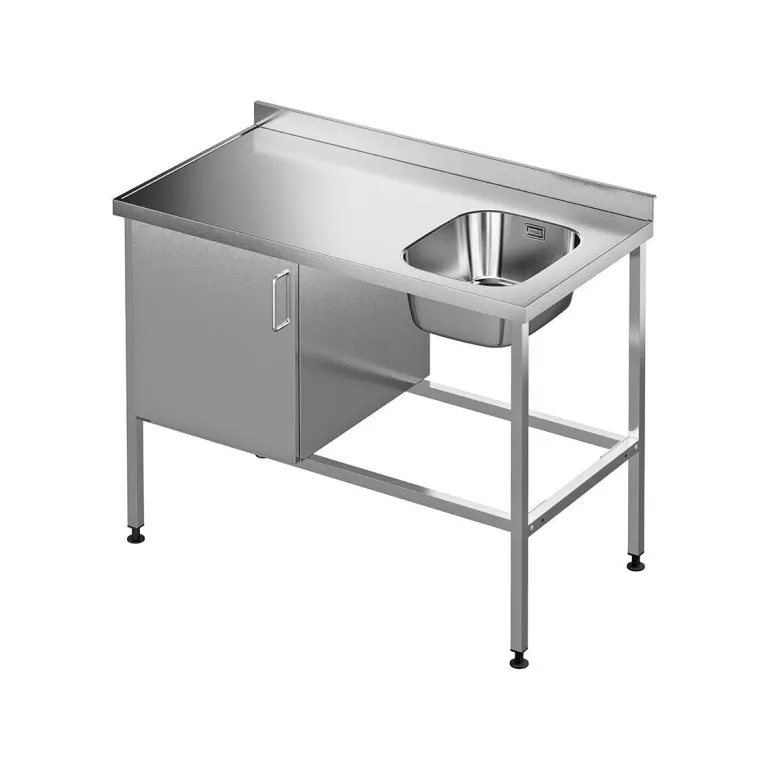 Pesupöytä jalustalla (hygieninen malli), jossa työtaso 1,25 mm hiotusta ruostumattomasta teräksestä. Mukana vesilukko ja koripohjaventtiili, pesuallas Iris 3440 (sijoitettu oikealle). Malli on valmiiksi koottu, kaappi 600 mm vasemmalla. Voidaan täydentää hyllyllä/ritilähyllyllä (irrotettava). Etu- ja sivureunat mallia 3. Takareunan korkeus 60 mm, etureuna 40 mm. Jalustan/jalkojen mitat 30×30 mm (neliöputkea), säädettävillä muovijaloilla.