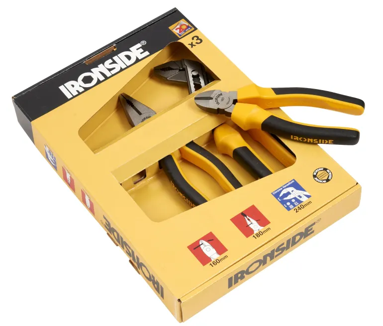 Kromivanadiiniterästä, pää kiillotettu ja suojalakattu. Ergonomiset kahvat kaksikomponenttimateriaalia. Sisältää kolmet pihdit.