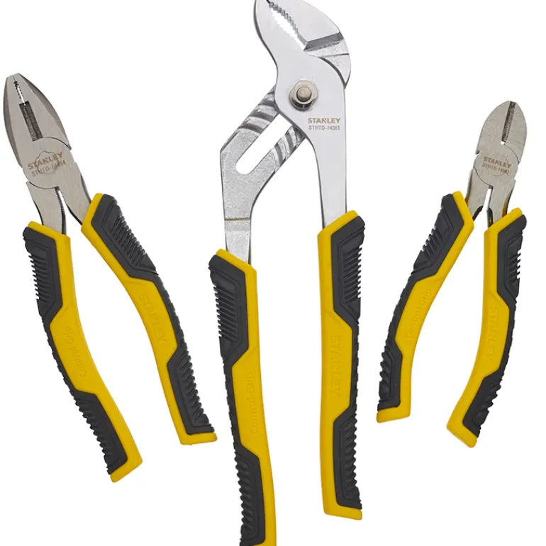 3-osainen pihtisarja, joka sisältää yhdistelmäpihdit, sivuleikkurit ja papukaijapihdit. Muotoillut kahvat parantavat käyttömukavuutta.