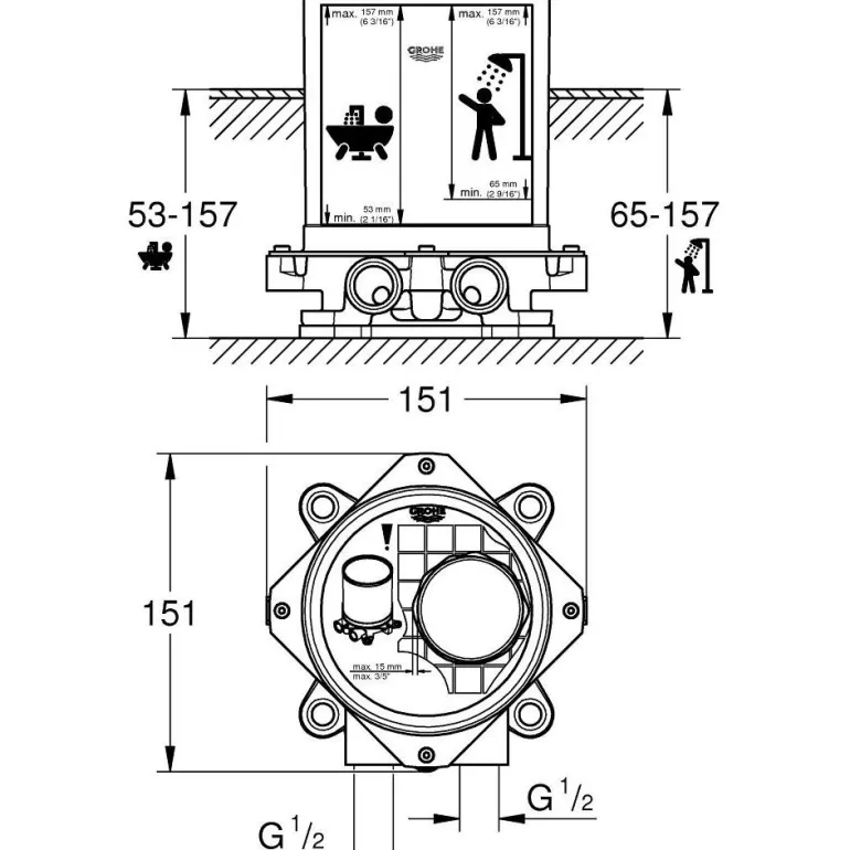 Upotusosa, jossa on kaksi 1/2″-tuloliitäntää kuuman/kylmän veden syöttöön. Lattiaan asennetuille kylpyammesekoittajille, hanoille ja suihkusekoittajille.