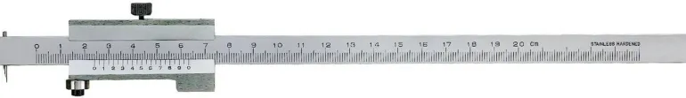 Ruostumatonta terästä. Mittatanko ja kelkka, kuten työntömitassa. Kuulalaakeroitu rulla vasteena työkappaleen reunaan ritsattaessa. Millimetriasteikko, nonius 1/10 mm / 39 mm. Vaihdettava karkaistu piirrotuskärki. Toimitetaan muovikotelossa.