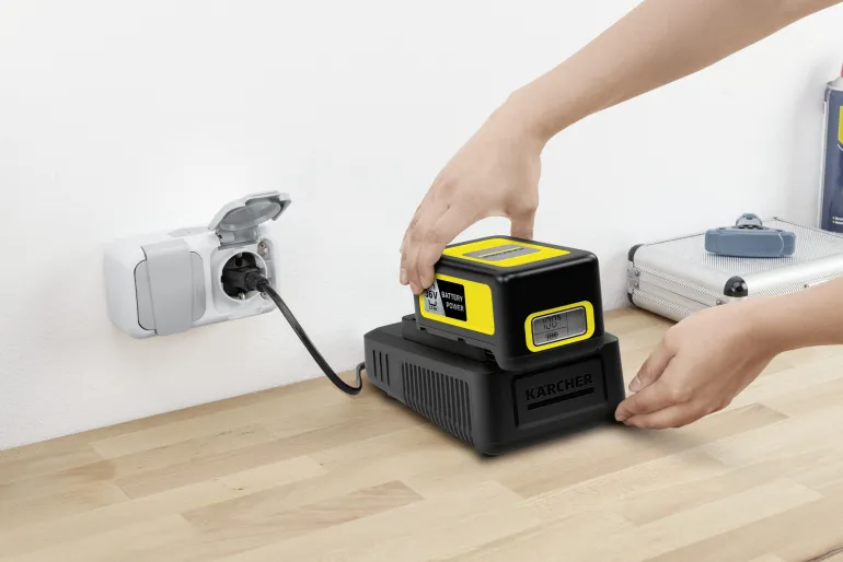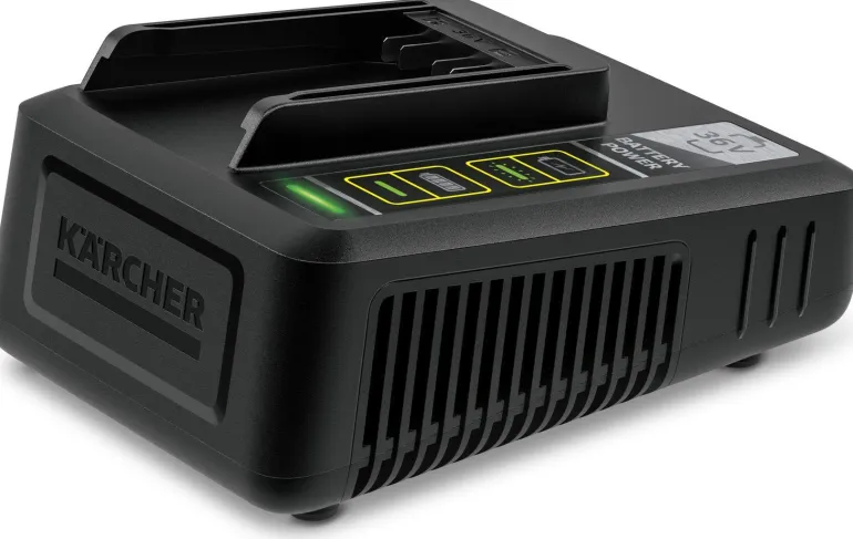 Kärcher 24450330 on käytännöllinen pikalatauslaite, joka voidaan kiinnittää helposti seinään integroidun seinäkiinnikkeen avulla. Pikalatauslaite lataa 36V/2,5 Ah litiumioniakun 80 %:iin vain 48 minuutissa.