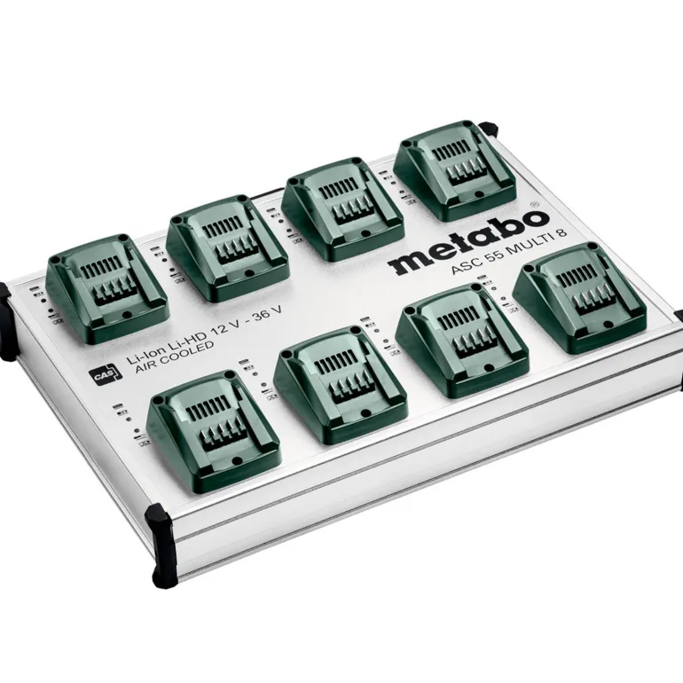 Metabo ASC 55 MULTI 8 -pikalaturi sopii jopa 8:n Li-ion- ja LiHD-liukuakun (12-36 V) rinnakkaiseen lataukseen. Laturissa on Metabon patentoitu AIR COOLED -lataustekniikka, joka jäähdyttää akkua latauksen aikana ja lyhentää näin latausaikaa merkittävästi. ASC 55 MULTI 8:ssa on vankka alumiinikotelo, jossa on koukku seinäasennusta varten sekä kantokahva.