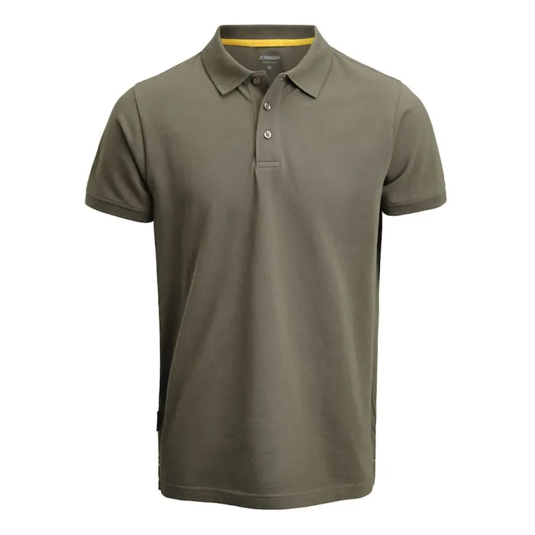 Jobman 5566 on pikeepaita single lacost -neulosta, nappilista edessä (3 nappia sävy sävyyn). Oranssi reunus kauluksen sisäpuolella ja halkioissa.