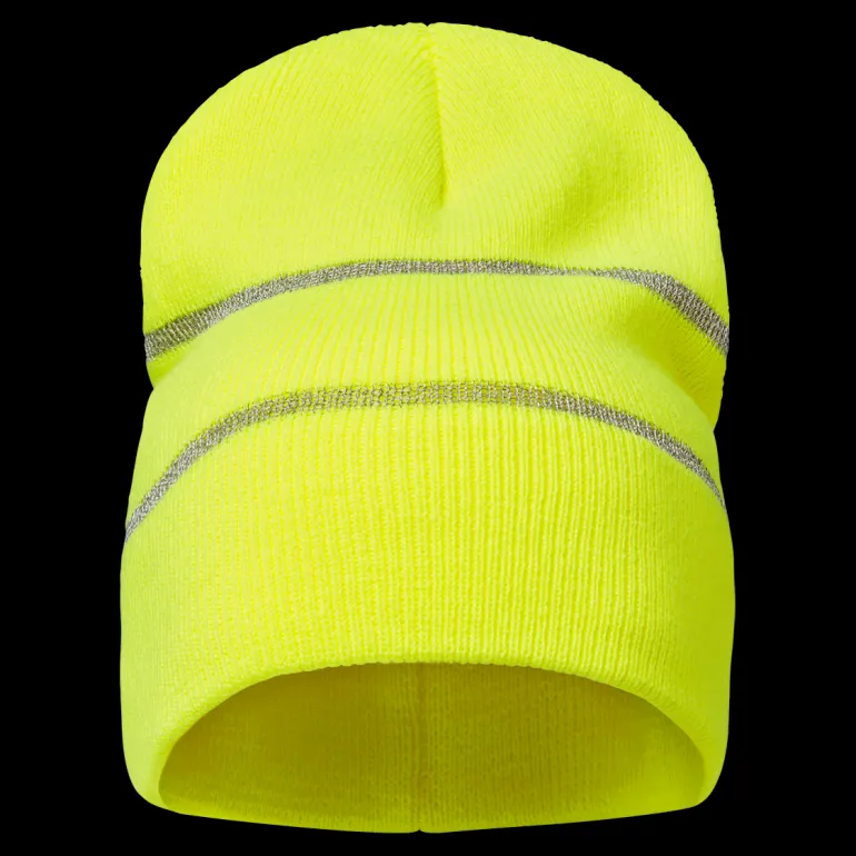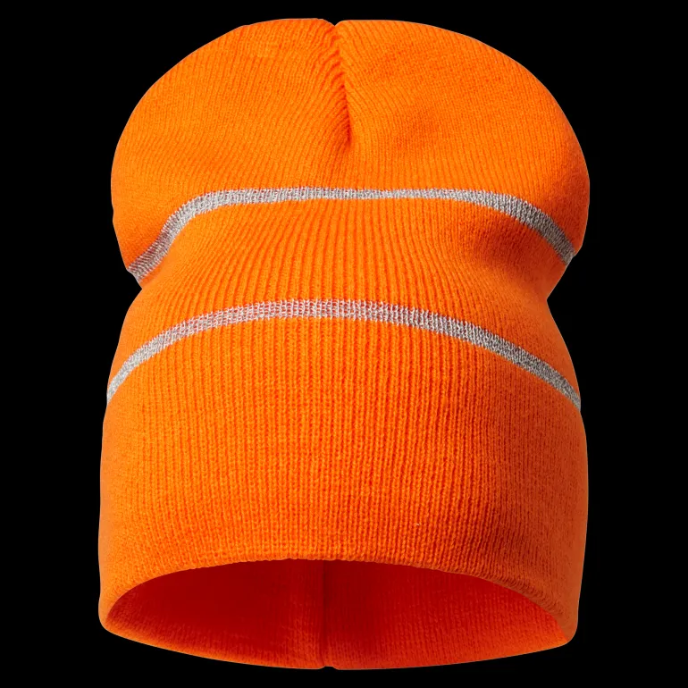 Lämmin pipo heijastinraidoilla näkyvyyden parantamiseksi. Ribbineulottu. One size. Materiaali: 100 % akryyli.