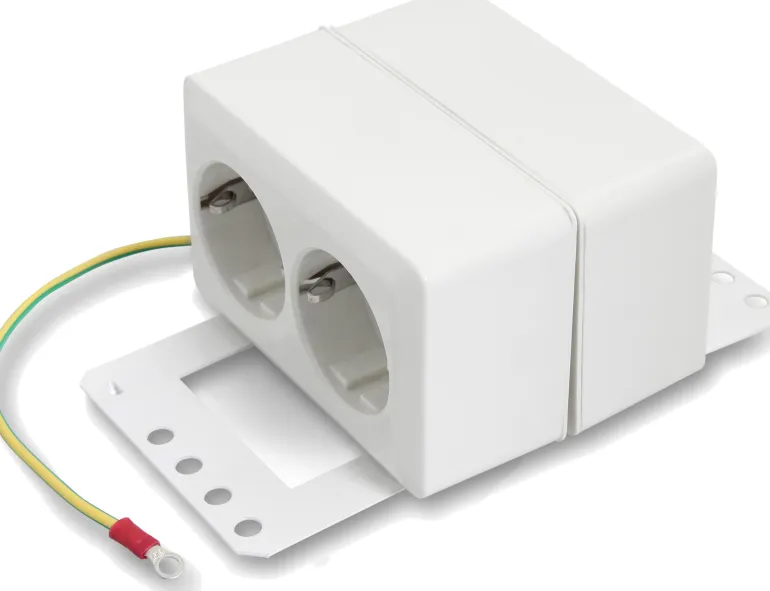 Eurolan 50S-21-11WT pistorasia, joissa 4 Schuko-pistoketta 230 V 10/16 A. Asennuslevyyn kiinnitetyt pistorasiat asennetaan Eurolan Home IT-keskuksiin, ja niiden avulla voi käyttää jopa 4 laitejohtoa tai muuntajaa. Pistorasia on silloitettu ja sovitettu keskussähköyksiköstä tulevan kaapelin suoraa ja kiinteää liittämistä varten. Sisältää 20 cm pitkän maadoituslangalla varustetun rengaskaapelikengän metallilevyyn liittämistä varten.