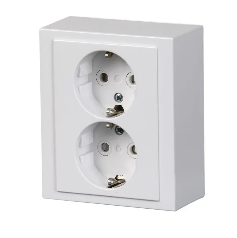 Impressivo -sarjan 2-osainen maadoitettu pistorasia pinta-asennukseen. Pistorasiassa on liittimet kutakin kosketinta kohden ja niihin voi kytkeä max. 4 johtoa (haaroitusmahdollisuus).