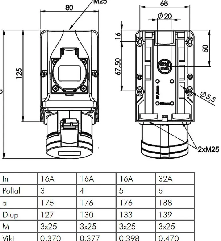 Pistorasia, jossa kaapeliliitäntämahdollisuus ylhäältä ja alhaalta, 41 x 52 mm. Sinisellä 230 V:n sukopistorasialla.