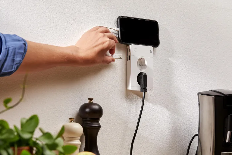 2-osainen seinäpistorasia, joka on maadoitettu 16 A. Seinäpistorasia on varustettu USB-latauksella, tyyppi A + C (enintään 2,4 A tyypille A ja enintään 3 A tyypille C). Pistorasiassa on oranssi LED-valo, joka ilmoittaa, kun puhelin/laite latautuu.