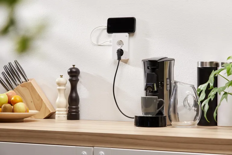 Pistorasiassa on oranssi LED-valo, joka ilmoittaa, kun puhelin/laite latautuu. Pistoke on suojattu ja soveltuu uppoasennettavaksi kojerasiaan, jonka c/c on 60 mm.