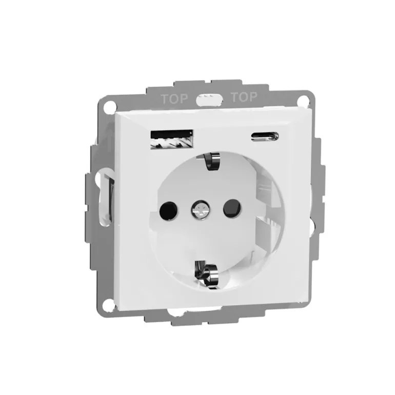 Pistorasia varustettu yhdellä suko-pistorasialla sekä USB A- ja C-latausporteilla. Tuote sopii maadoitetuille käyttökohteille.