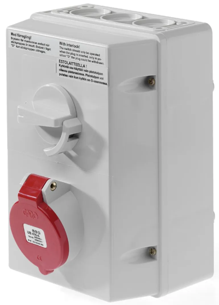 Garo UBV 416-6 S on vedenpitävä pistorasia seinäasennukseen. Etupuolella on yksi IEC/CEE-pistorasia, joka on lukittavissa päälle ja pois päältä -asentoon ja jossa on runsaasti kytkintilaa. Kaapelin sisääntulo sekä ylä- että alapuolella.