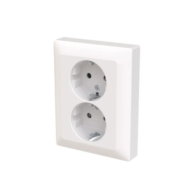 2-osainen pistorasia peitelevyllä. Pistorasiassa on liittimet kutakin kosketinta kohden ja niihin voi kytkeä max. 4 johtoa (haaroitusmahdollisuus). Liittimet on hyväksytty ML ja MK johtimille. Ei potentiaalivapaita liittimiä. Pistorasian runko on kosketussuojainen ilman peitelevyä. Muoviraaka-aineessa erittäin korkea UV-suojaus. Valkoinen RAL9003.