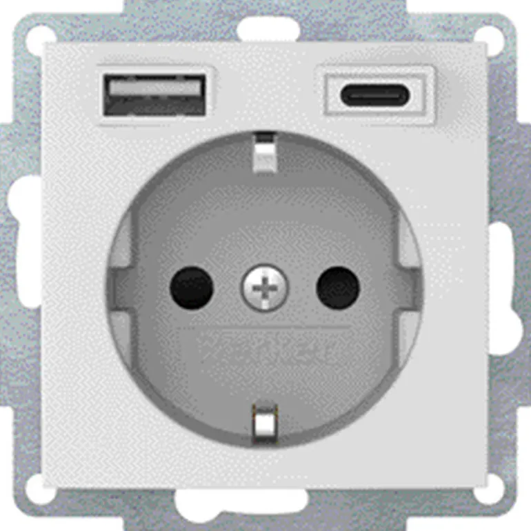Pistorasia 1-osainen 2:lla USB-liittimellä tyyppi A (2,4A) ja tyyppi C (3,0A) mobiililaitteiden kuten tablettien, älypuhelinten, navigointilaitteiden ja digitaalikameroiden lataamiseksi USB-kaapelin kanssa. USB-liitynnät on oikosulku- ja ylikuormitussuojattu (elektroninen sulake). Rasian asennus uppoasennukseen kojerasiaan tai pinta-asennukseen pinta-asennusrasian kanssa. Tuote voidaan asentaa joko ruuvikiinnityksellä tai kiinnityskynsillä. Liitynnät jousiliittimin.