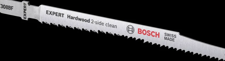 Bimetalliterän pikateräsnauha on liimattu taipuisaan terästerään. Bosch EXPERT ’Hardwood 2-side clean’-pistosahanterä on riittävän luja, jotta sillä voidaan sahata laminoidusta lastulevystä tai kovapuusta valmistettuja pöytätasoja. Repeämättömään suoraan sahaukseen (T308BF) ja repeämättömään täsmälliseen kulmatarkkaan sahaukseen (T308BFP).