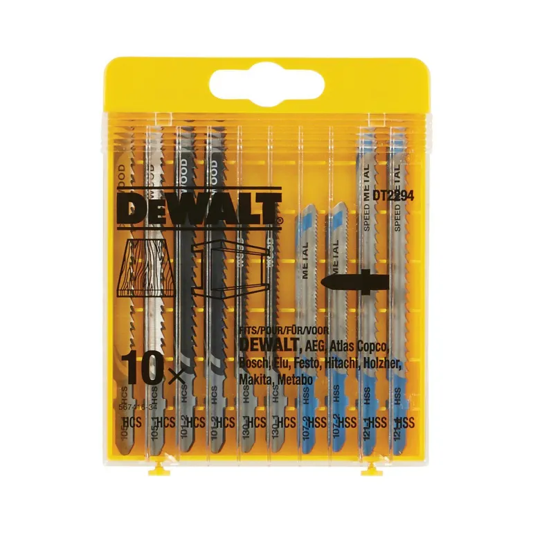 10-osainen pistosahanteräsarja, joka sisältää puun ja metallin leikkaamiseen tarkoitettuja pistosahanteriä.