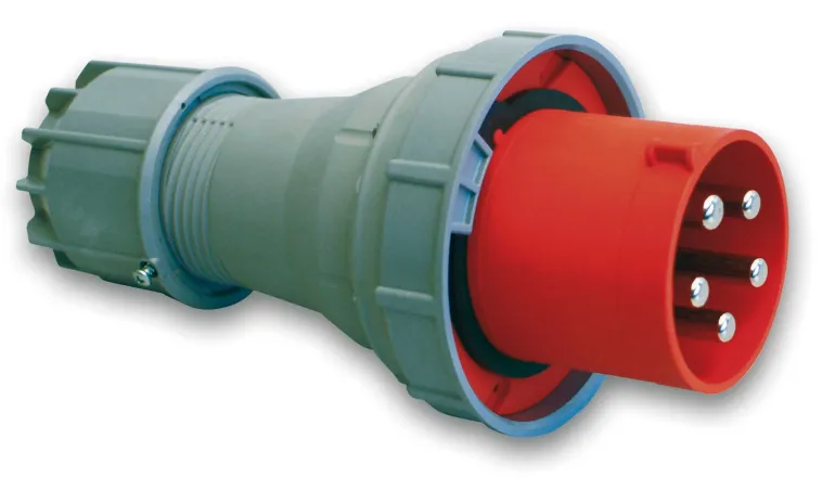 Pistotulppa, jossa on 5 napaa ja IEC-virta 63A tai 125A. Malli on vesitiivis ja siinä on punainen tunnistusväri.