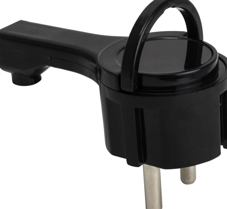 Pistoke, joka ulkonee vain noin 10 mm pistorasiasta ja jossa on sisäänrakennettu kahva, jotta se voidaan helposti vetää irti pistorasiasta.