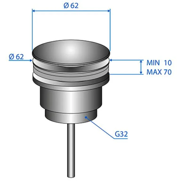 Kromattu pohjaventtiili pesualtaille, ylivuotoaukolla ja painettavalla mekanismilla. Mitta 10–70 mm, halkaisija 62 mm. G32-ulkokierre.