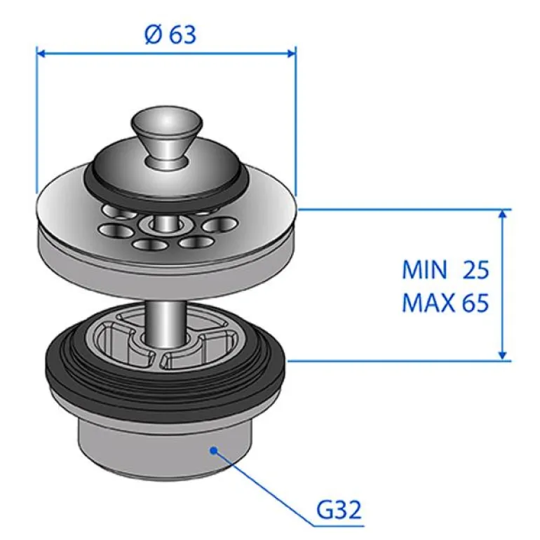 Pohjaventtiili pesualtaille, ylivuotoaukolla. Halkaisija 63 mm ja mitta 25–65 mm. G32-ulkokierre liitäntää varten.