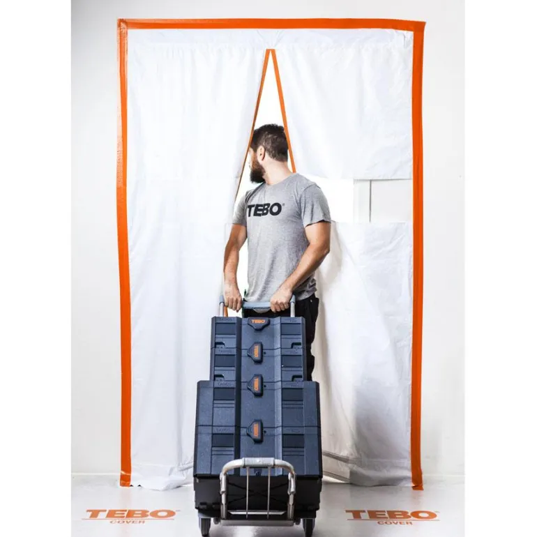 TEBO Cover 869650 on palonkestävästä nailonista valmistettu pölysuojus, jota käytetään oviaukon suojana esimerkiksi remontoitaessa. Aukko on suora ja ulottuu lattiaan asti. Siinä on magneetit, joten se sulkeutuu automaattisesti. Ovessa on läpinäkyvä osa näkyvyyden parantamiseksi. Toimitetaan säilytyslaukussa.