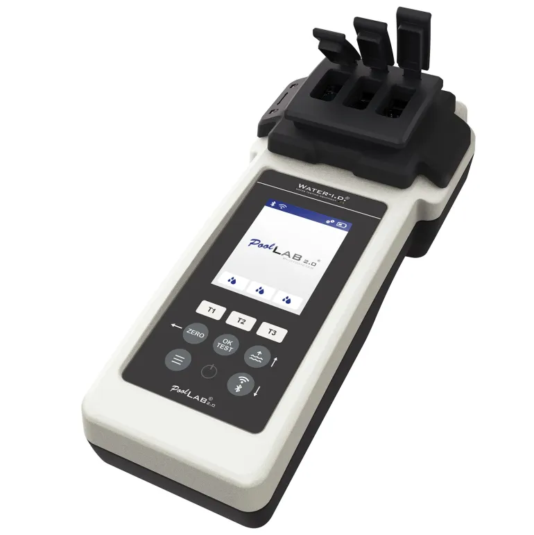 Mittaa digitaalisesti 24 parametria: Kloori (vapaa l yhdistetty l yhteenlaskettu) , pH-arvo, emäksisyys (happokapasiteetti) syaanihappo (stabilisaattori), aktiivihappi, bromi, klooridioksidi, otsoni, vetyperoksidi, alumiini, ammonium, kalkin kovuus, kloramiini, kupari, rauta, nitraatti, fosfaatti, PHMB, kalium, QUAT, sulfaatti, kokonaiskovuus, urea ja sinkki. Suora pääsy 0-testi-tallennukseen 9 painikkeella (vaatii vain l x/mittausnäyte) ja allasveden 24 eri parametriin. Pool Lab 2.0 on sisäänrakennettuna sekä Bluetooth että Wi-Fi, joilla saat aktiivisen yhteyden joko ilmaiseen LabCom®ohjelmistoon ja -sovellukseen, tai joilla voit synkronisoida tiedot automaattisesti LabCom® Cloudissa. Ilmainen pilvipalvelu – jossa Pool Lab® 2.0 voi synkronisoida tiedot automaattisesti WiFi-yhteyden kautta – varmistaa, että ohjelmisto ja sovellus käyttävät aina samaa tietokantaa.