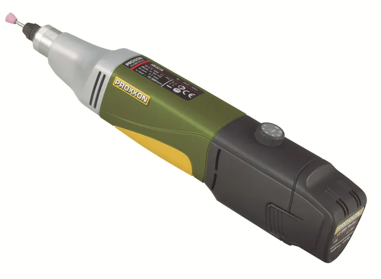 Akkukäyttöinen porahiomakone. Sopii Proxxon-akkuun Li/A (495134). Akku ja latauslaite myydään erikseen. Portaaton elektroninen kierrosluvun säätö. Kuulalaakerilla varustettu tarkkuusakseli, kuusi kolmiosaista teräskiristyshylsyä (1,0 – 1,5 – 2,0 – 2,4 – 3,0 – 3,2 mm, sis. kiristysmutteri). Valualumiinista valmistettu etuosa, lasikuituvahvisteisesta polyamidista valmistettu kotelo.