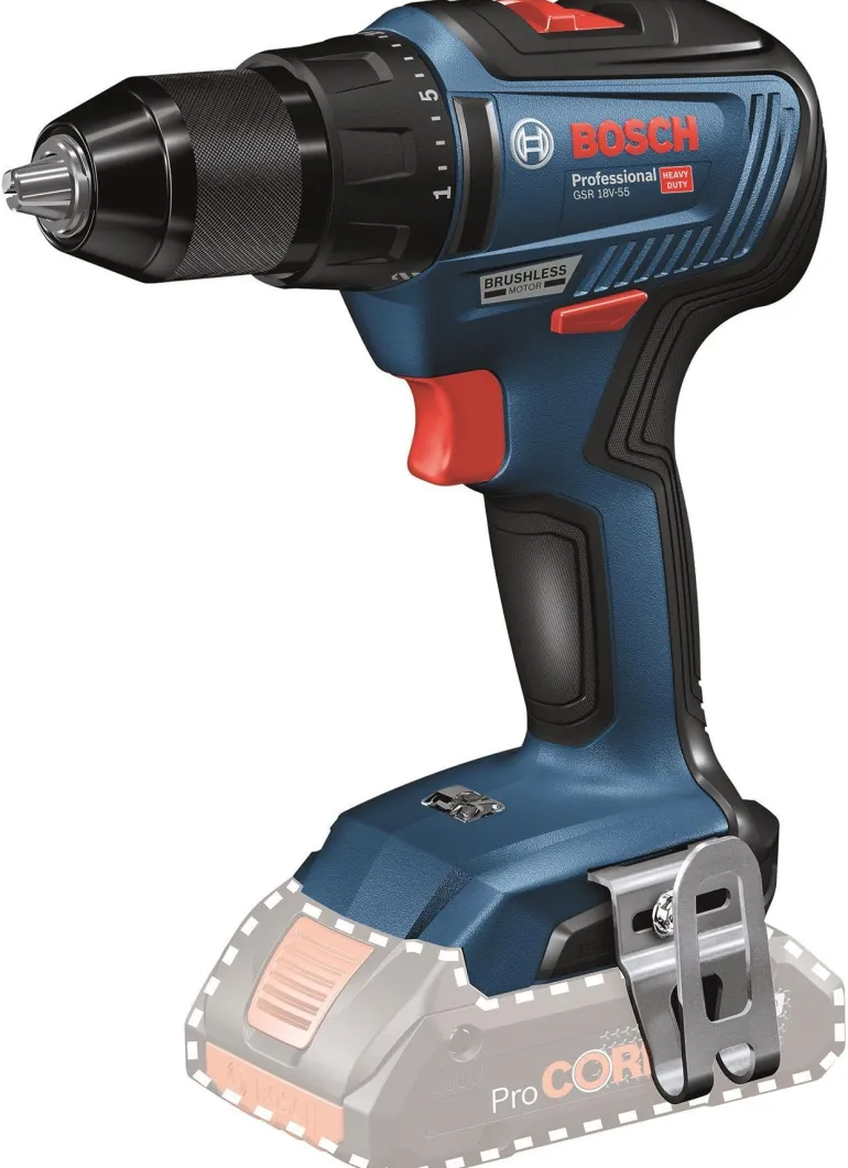 Bosch GSR 18V-55 Professional-akkuporakone/ruuvinväännin on erinomainen ensihankinta siirryttäessä Boschin 18V-työkaluluokkaan. Porakoneessa on suorituskykyinen harjaton moottori, joka tarjoaa 55 Nm:n vääntömomentin ja 1 750 kierr./min käyntinopeuden tehokkaaseen poraamisen puuhun ja metalliin. Harjaton moottori antaa lisäksi pidemmän käyttöajan per lataus sekä pidemmän käyttöiän työkalulle.