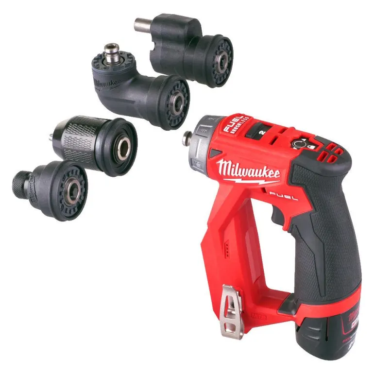 Milwaukee M12 FDDXKIT-202X on tehokas, kompakti, kaksinopeuksinen 12 V:n porakone ja irrotettava istukkajärjestelmä, jolla yhdistät neljä lisäosaa useita sovelluksia varten. Mukana 10 mm:n metalli-istukka, suorakulmalisäosa, offset-lisäosa ja 6 mm:n kuusiokolokiinnitys Mukana on myös akut, laturi ja laukku. Mukana toimitettu laturi lataa työkalun 40 minuutissa. Porakone on varustettu Milwaukeen suunnittelemalla ja rakentamalla hiiliharjattomalla POWERSTATE™-moottorilla, jonka vääntömomentti on jopa 34 Nm. ¼ tuuman kuusiokolo istukan takana, joka tarvittaessa lyhentää poran pituuden 130:een. Istukan kapasiteetti on 10 mm ja ruuvinvääntimen kärkipidike on magneettinen. Kehittynyt digitaalinen REDLINK PLUS™ -elektroniikka suojaa työkalua ja akkua ylikuormitukselta ja parantaa työkalun suorituskykyä kuormituksen aikana. Joustavalla akkujärjestelmällä, joka sopii kaikkiin Milwaukee® M12™-paristoihin.